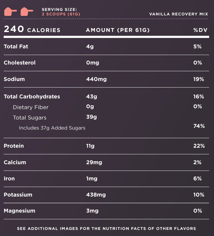 Recovery Mix contains sodium, potassium, calcium, and magnesium to restore electrolyte balance* and replace what you sweat out during exercise. *Meets WHO hydration standards.